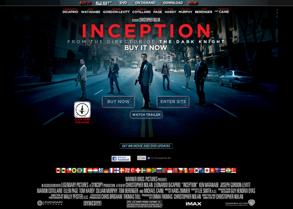 The second film website I decided to analyse was our main source text ‘Inception’, which in terms of creativity was my favourite. I noticed that Warner Bros always kept the production names and logos always at the bottom of each of their film websites. Also, there is an opportunity for viewers to stay connected with the Facebook ‘like’ button just at the bottom of the page which is a viral marketing technique to help gain exposure for the film. Similar to ‘I am Legend’ the puff at the top of the page offers DVD options for a chance to buy. In addition, I came under the realisation that the main point of a film website is try and get viewers to buy the DVD emphasised by the bold capitals of ‘BUY IT NOW’ spread throughout the main page above.